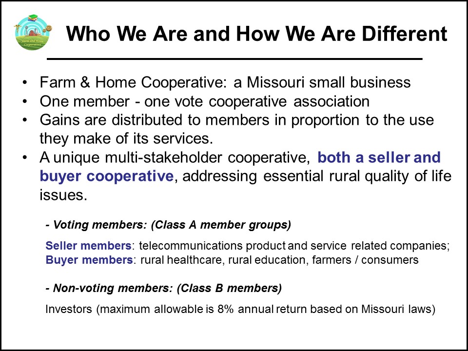 Farm & Home Cooperative is unique in Missouri/Kansas. the Midwest, and the United States in its approach to serving rural farming areas by using a rural-tailored multi-stakeholder (or “hybrid”) cooperative model which represents a departure in ownership structure from the more familiar single-class telecommunications, electric power, agricultural producer, and credit /consumer / food / worker co-ops models.